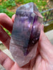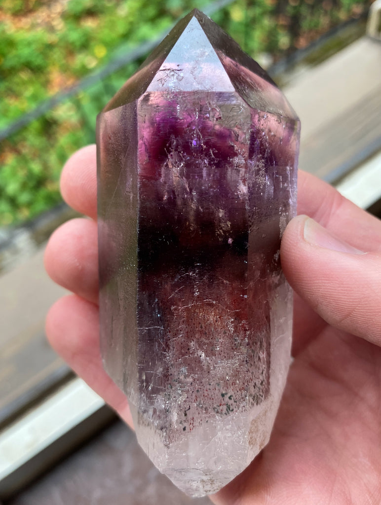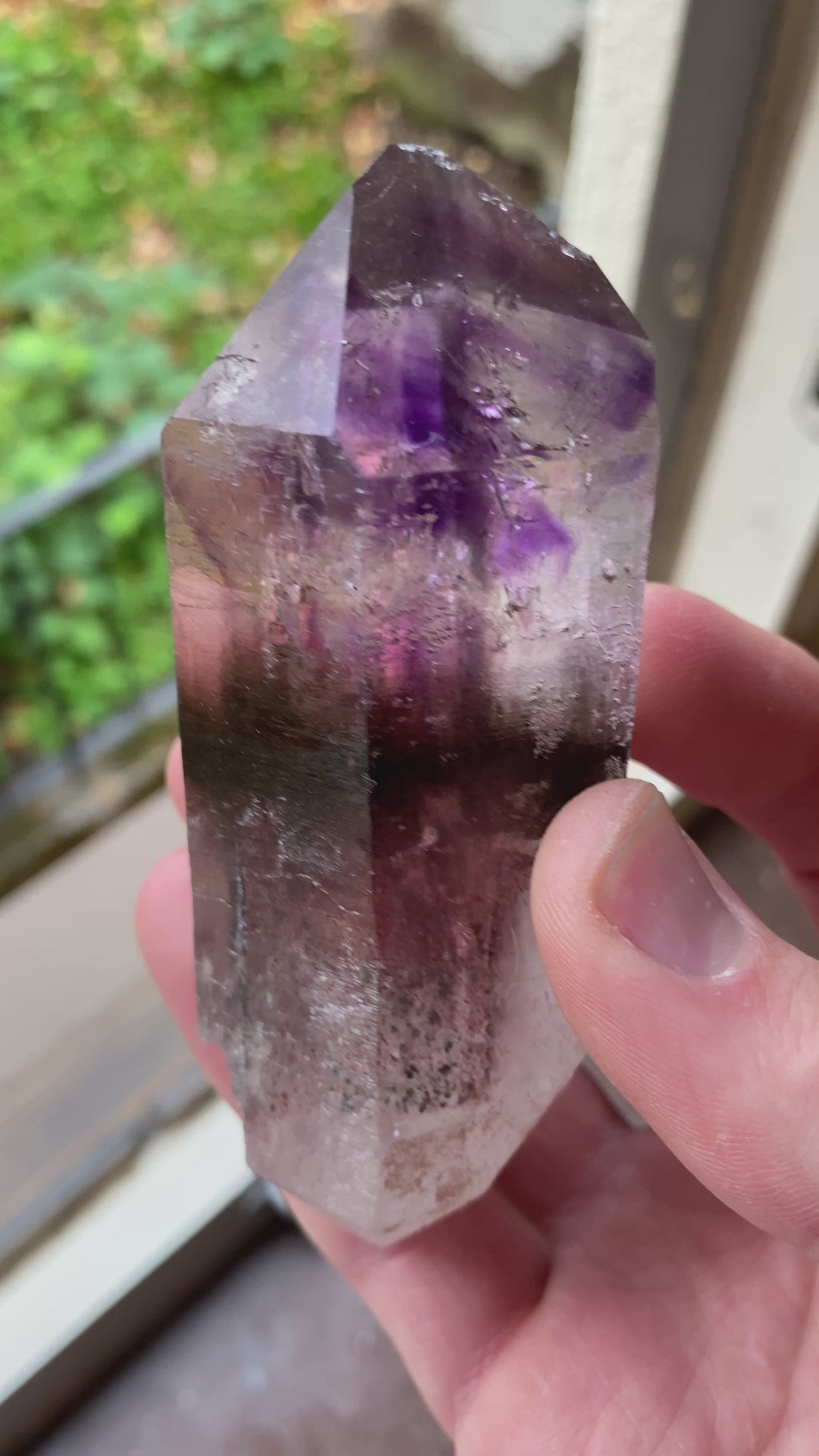 Ovanligt stor dubbelterminerad Brandberg Ametist med Rökkvarts och klar Bergkristall. Något naggad i ena toppen. För övrigt utsökt kvalite.