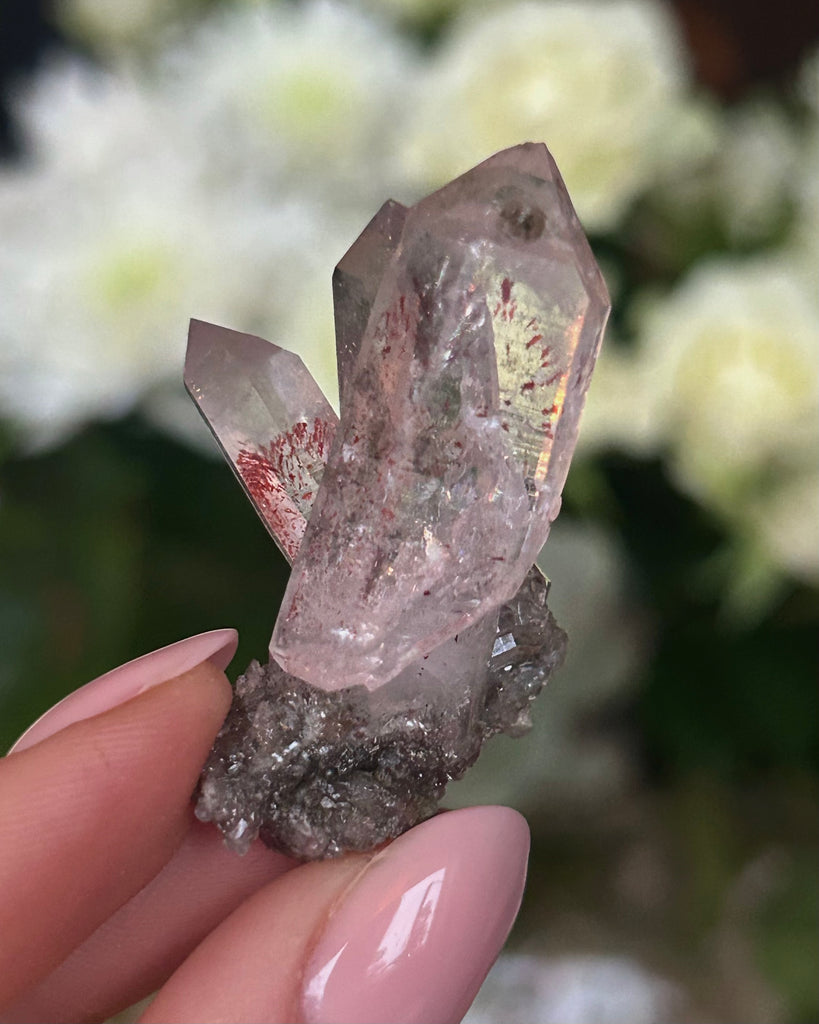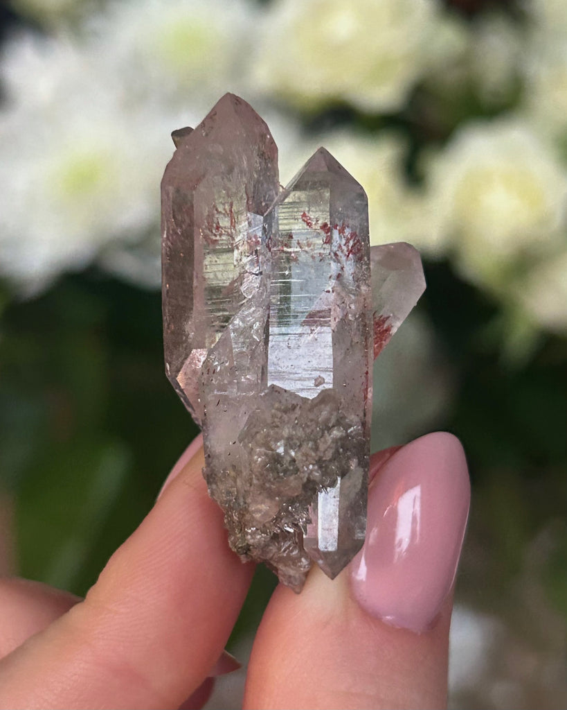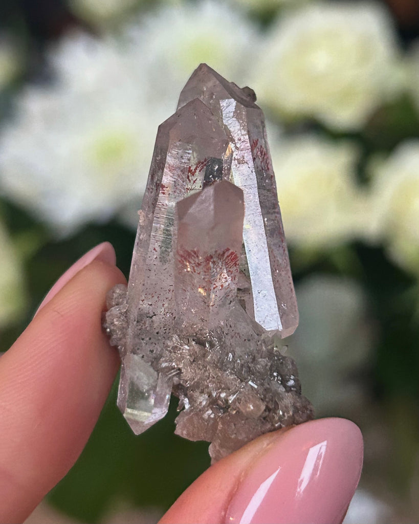 Vackert kluster av bergkristall med inneslutningar av röd Hematit!