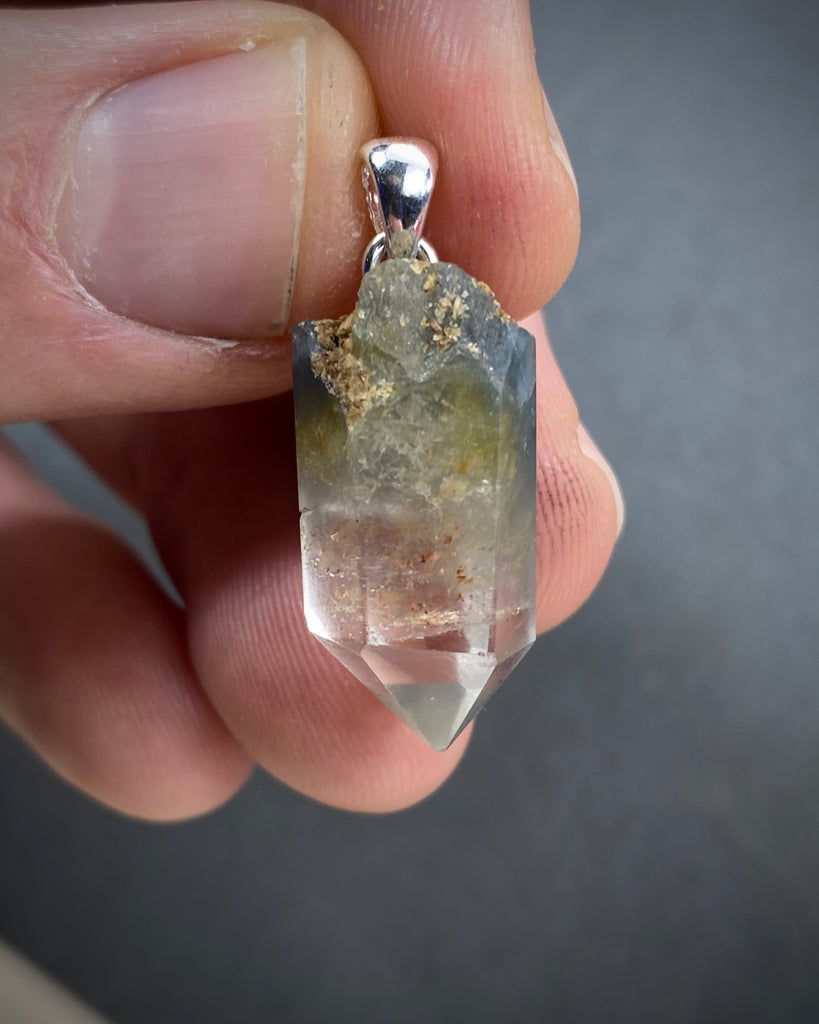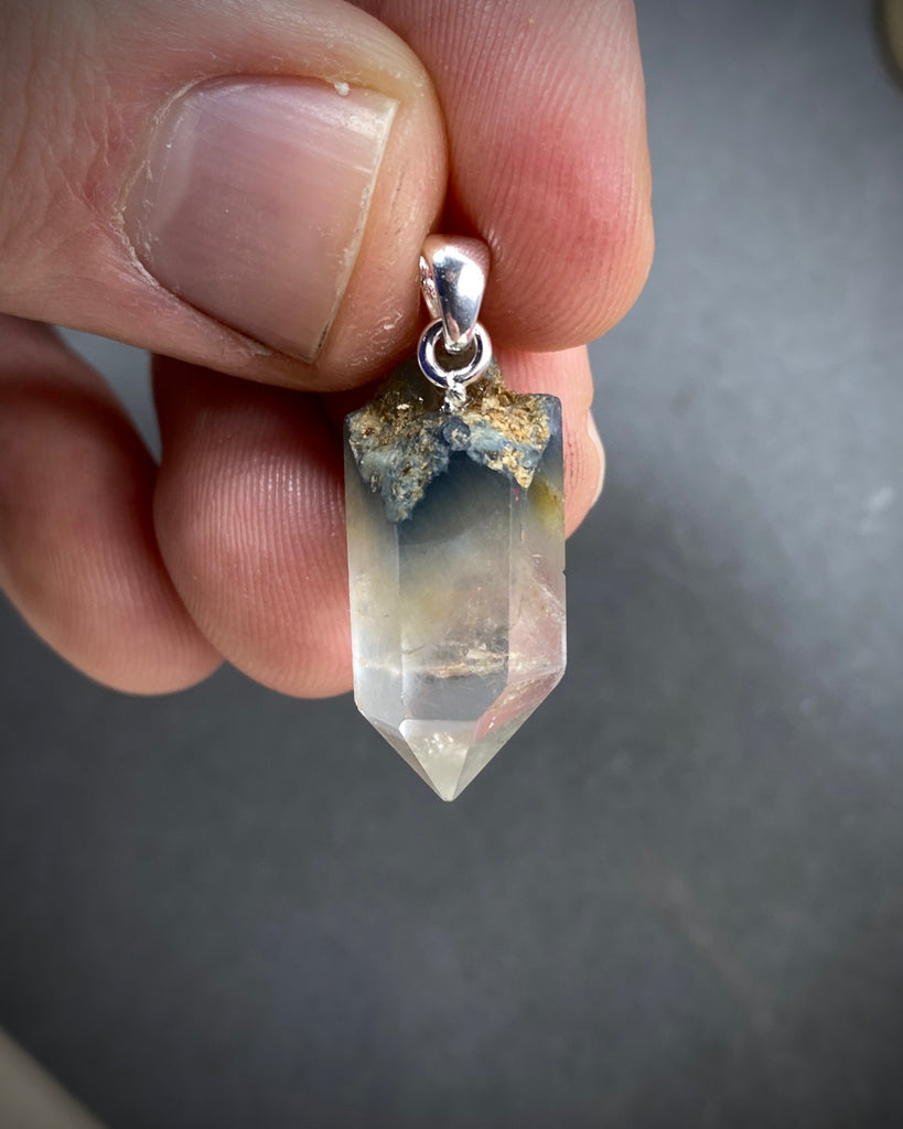 Slipad Bergkristall med Amfibol inneslutning. Med silverögla (925 silver).