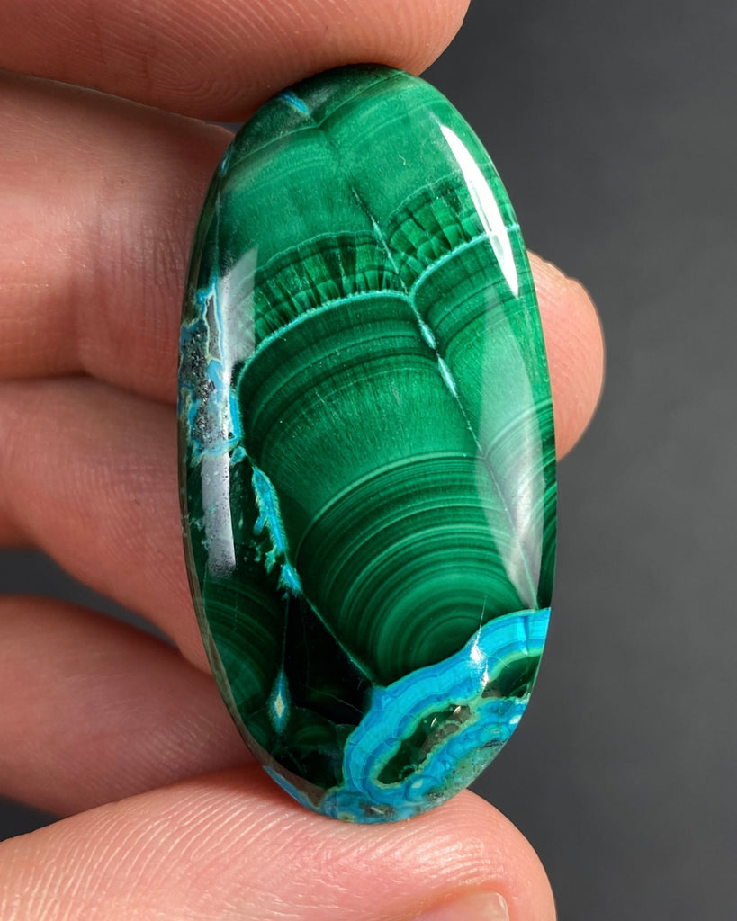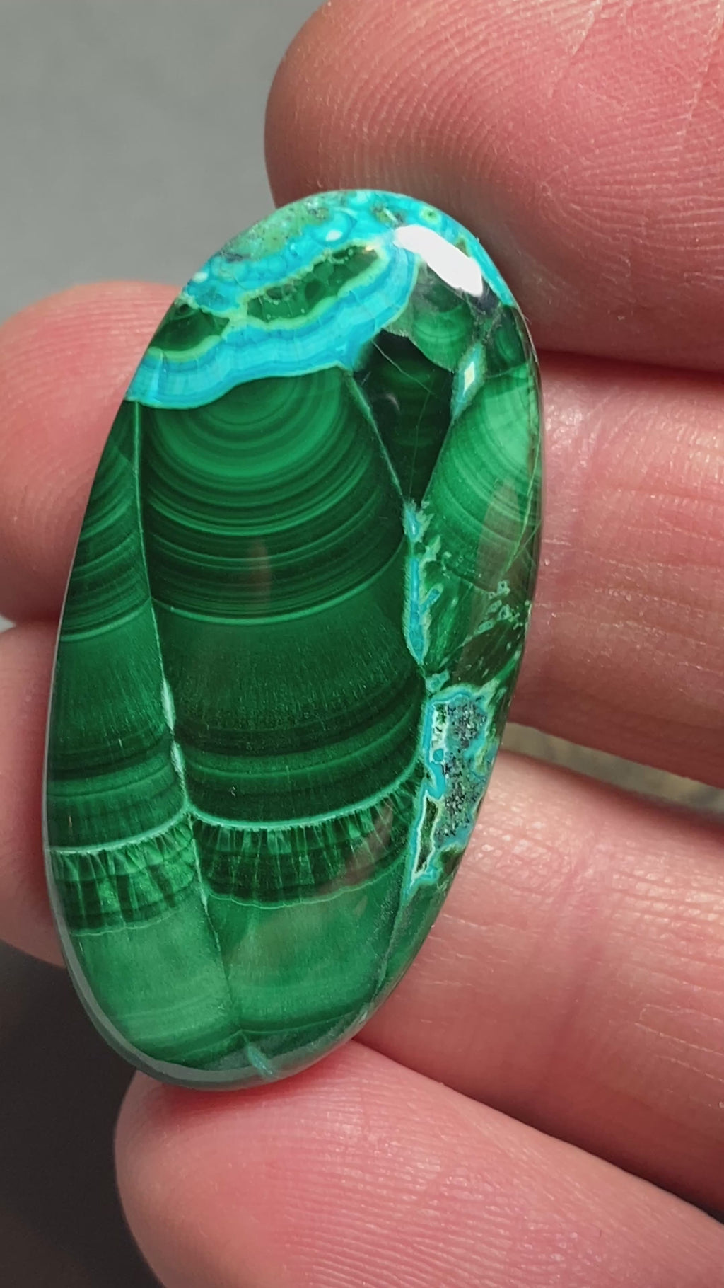 Fin Malakit med "kattöga effekt". Samt Inslag av Krysokolla.